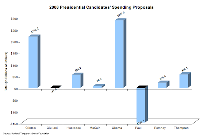 I did some checking on these figures, and what I don't like about this graph is that it represents new expenditures only. Take this analysis from the same source (http://www.ntu.org/pdf/P0801Obama_Analysis.pdf). M. Iraq – Withdrawal:“All Combat Troops Redeployed by 2009: Barack Obama would immediately begin redeployingAmerican troops from Iraq. The withdrawal would be strategic and phased, directed by militarycommanders on the ground and done in consultation with the Iraqi government. Troops would beremoved from secure areas first, with troops remaining longer in more volatile areas. Thedrawdown would begin immediately with one to two combat brigades redeploying each monthand all troops engaged in combat operations out by the end of next year.”http://my.barackobama.com/page/-/pdf/Fact%20Sheet%20Iraq%20Final.pdfCost: Unknown.Note: Depending on how long it will take to complete the demobilization, and where andhow the troops are re-deployed, this may or may not have significant savings.May or may not have significant savings? I'm not sure if that represents a fair analysis. Besides, if Obama wants to put $100 billion into healthcare and $30 billion into education, science, and research, then I'm all for them.